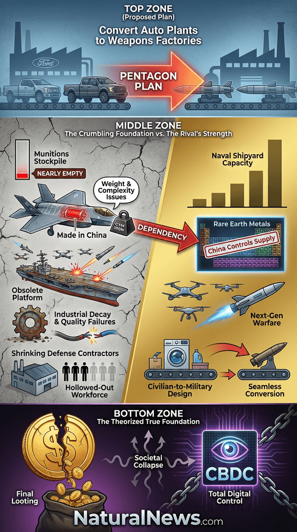 Second, and more sinister, it is the theater to justify the roll-out of total control. Societal collapse, whether through financial hyperinflation or the chaos of a lost war, is the perfect crisis to mandate a biometric Central Bank Digital Currency (CBDC) grid. War provides the emergency powers to suspend liberties, mandate digital IDs, and erase financial privacy forever. The true objective isn’t merely victory over China; it’s the final subjugation of the American people under a digital Panopticon. The war is the distraction, and the conversion of auto plants is part of the stagecraft, making the mobilization feel real while the real theft occurs in the financial markets and the halls of policy.